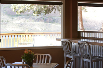 This transformative remodel changed the space from a boring, bright white convenience store into a warm and inviting gathering place to sit and look out the windows at the dramatic canyon and Lake Billy Chinook.